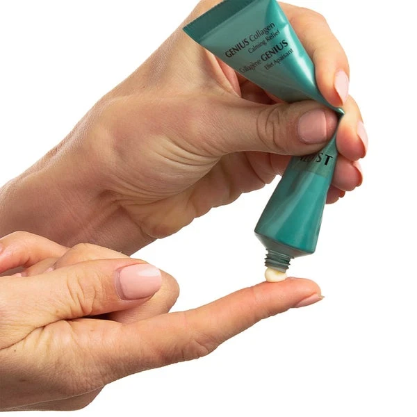 GENIUS Collagen Calming Relief is a concentrated but ultra-gentle restorative treatment that is specifically formulated to treat mild skin discomfort. For all skin types including skin showing signs of sensitivity, this luxurious cream provides a cushioned layer on the skin that immediately comforts dryness, tightness and the look of redness associated with rough, dry skin. Infused with our exclusive Active Vegan Collagen™, Alguronic Acid® Calendula & other soothing agents, this formula is scientifically designed to provide a multi-pronged approach that effectively combats the look of compromised skin, by absorbing quickly, visibly reducing redness associated with rough skin & the look of irritated skin, balancing and protecting moisture retention, while restoring bounce & resilience. Calendula and other soothing agents from Oats & Alpine Plants are known to help fight skin fatigue, creating a relaxed skin appearance, and reducing discomfort caused by skin aggressors. Skin is left treated, hydrated & protected from dryness, redness, and other signs of sensitive skin. Size: 40mL, 1.35 fl oz.